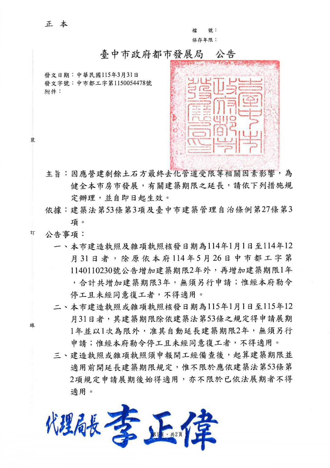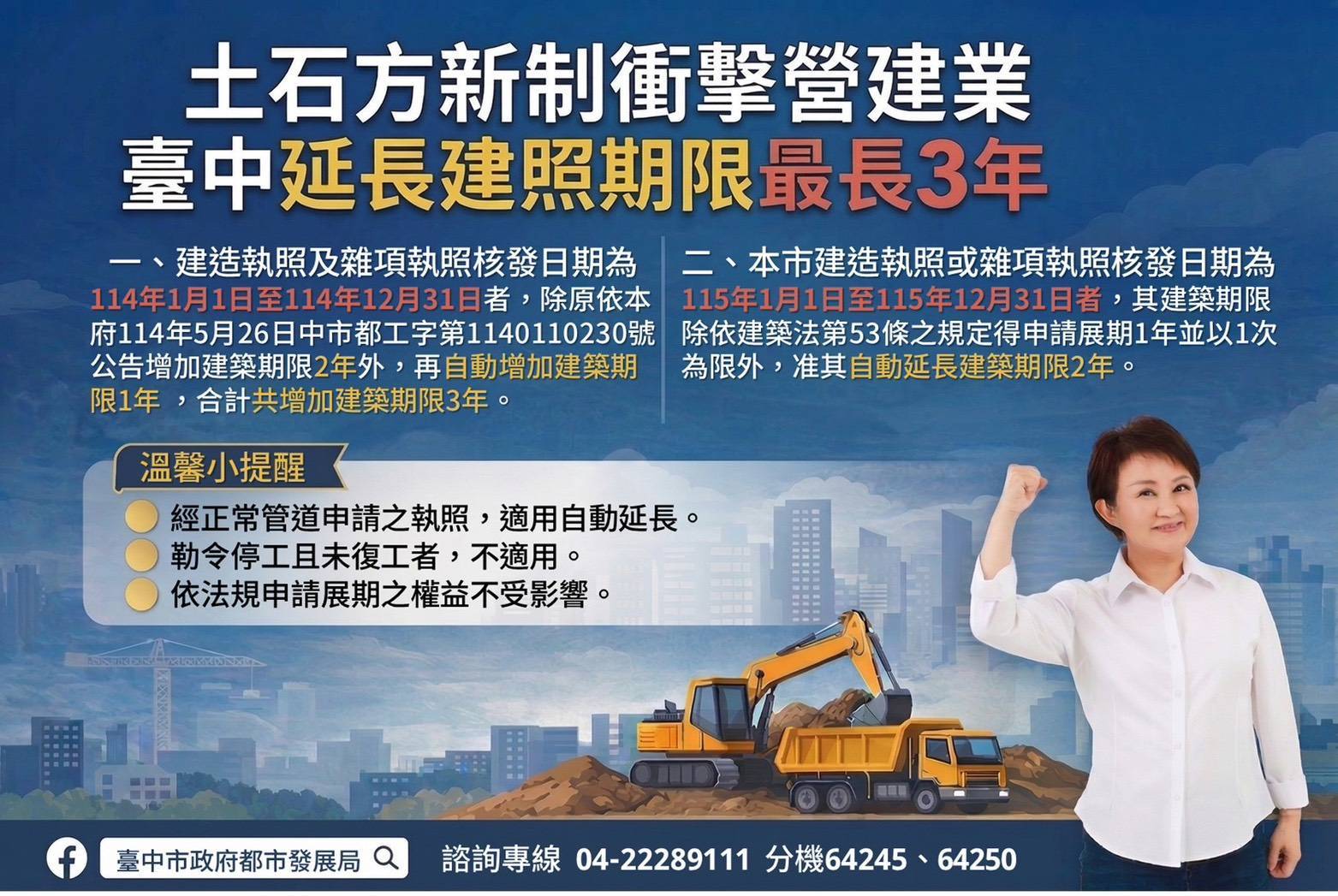 為因應近期土石方去化受限及整體營建環境變動,臺中市政府都市發展局針對114年及115年度核發之建造執照及雜項執照案件,公告建築期限延長措施。